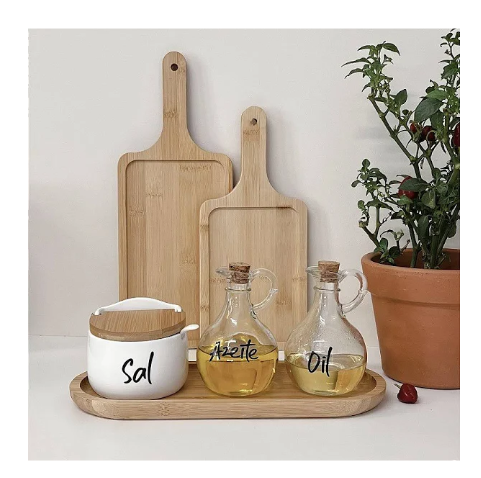 KIT 1 SALEIRO DE PORCELANA 2 GALHETEIROS E BANDEJA DE BAMBU